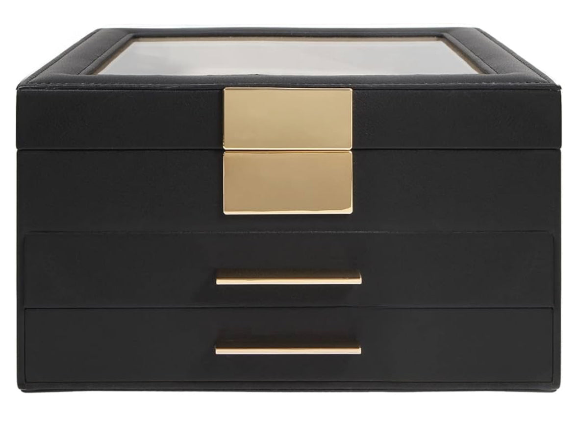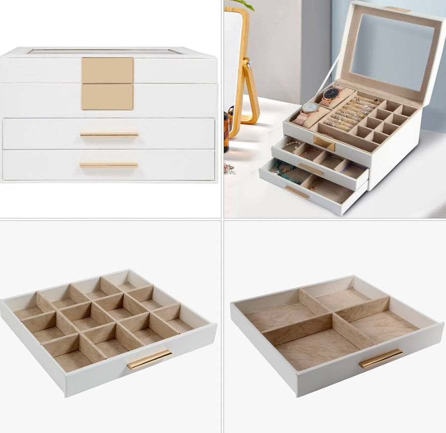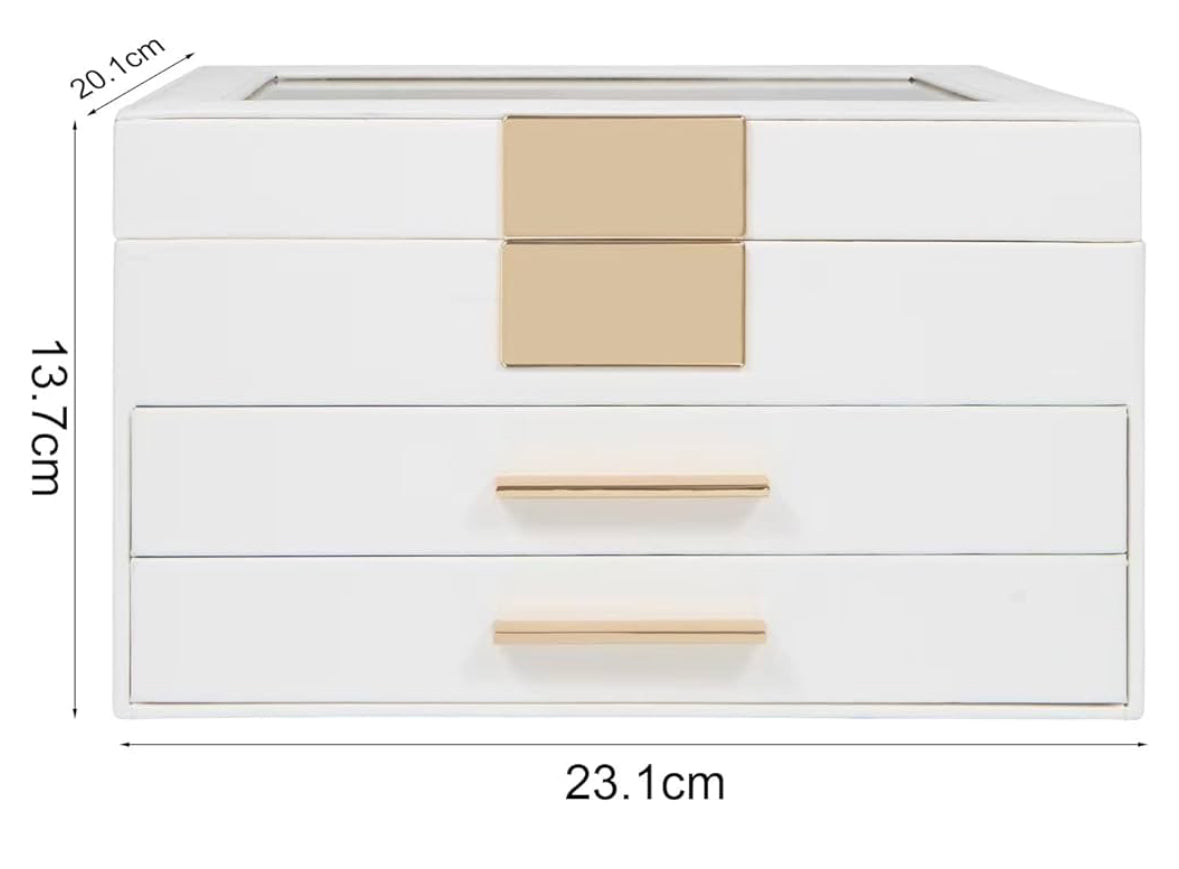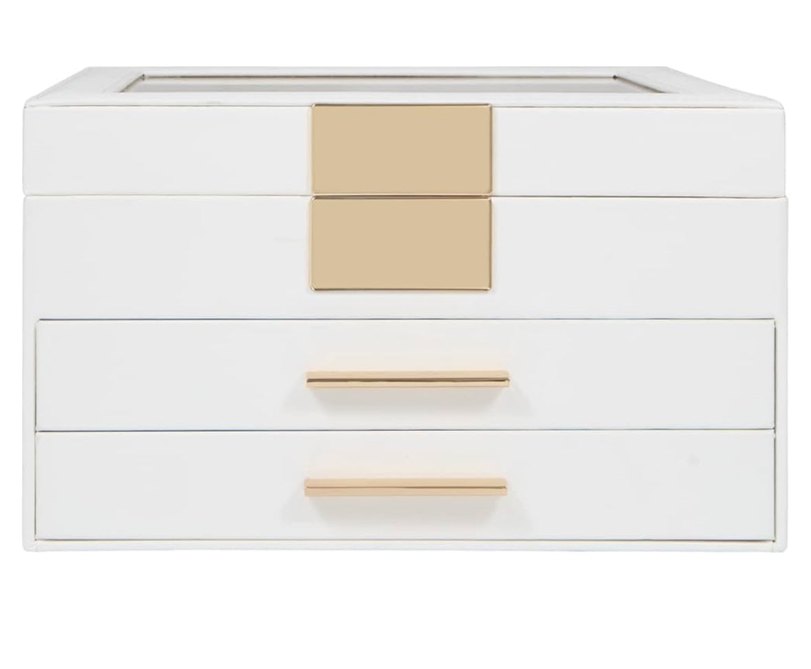 La boîte à bijoux parfaite pour organiser et exposer vos trésors. Avec son couvercle transparent, ses 3 niveaux et ses 2 tiroirs, elle offre un espace de rangement optimal. Utilisez le présentoir à montre pour mettre en valeur vos plus belles pièces. Disponible en blanc.