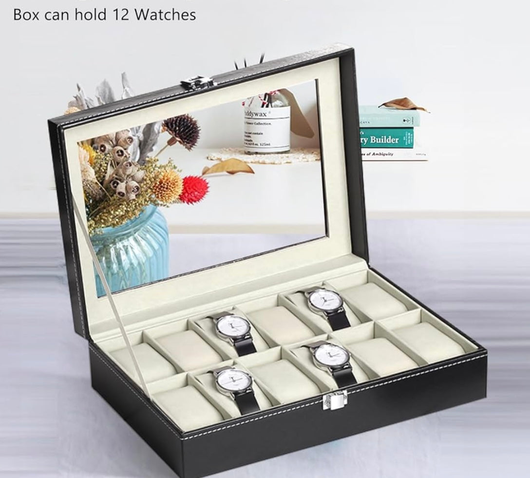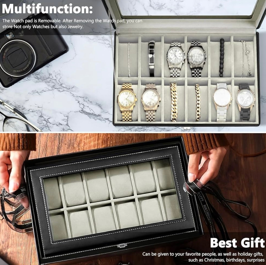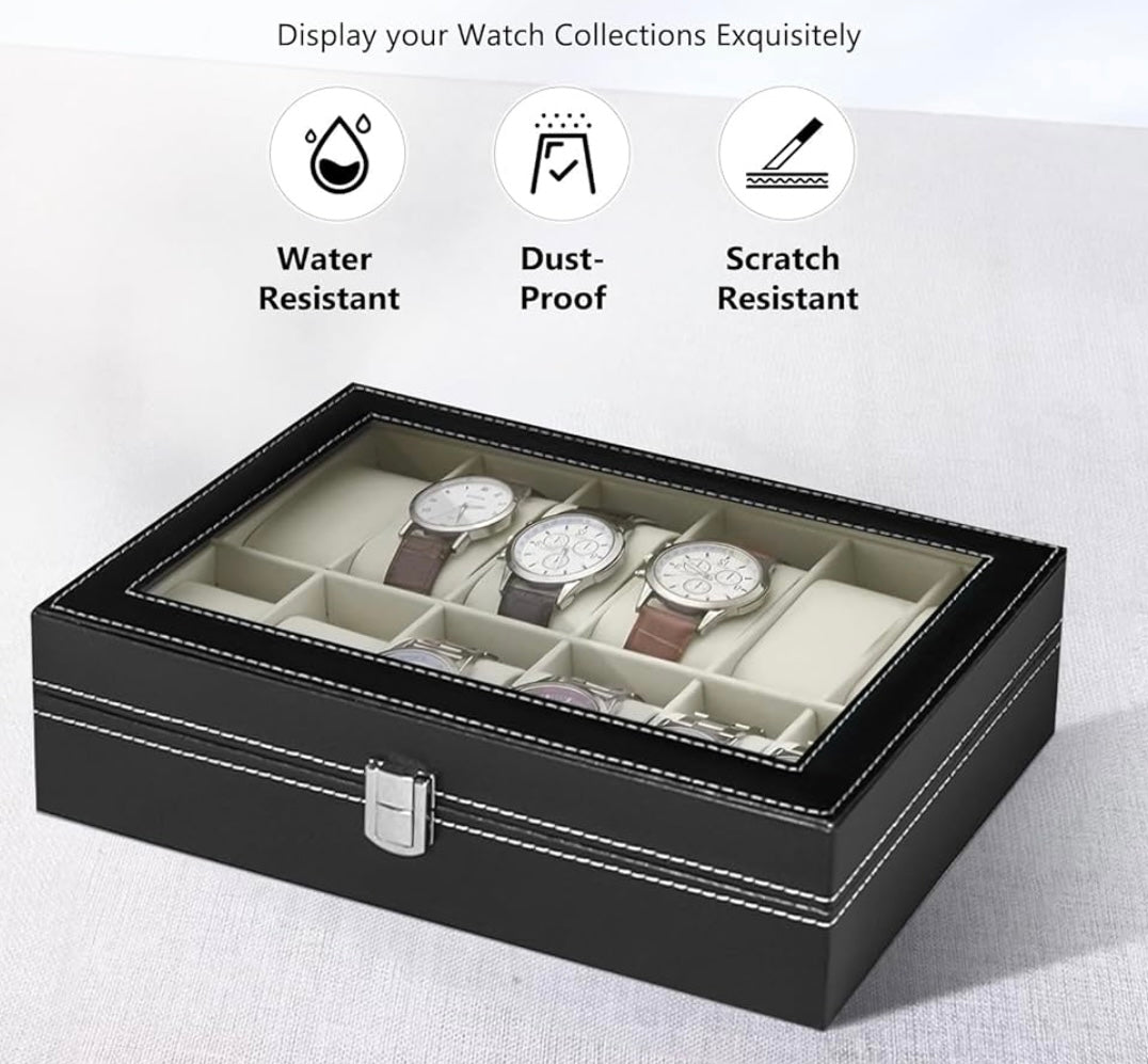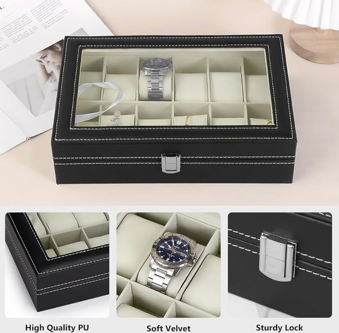 Offrez à vos montres une maison de luxe avec cette boîte de rangement à 12 compartiments. Le couvercle en verre vous permet de les admirer sans les toucher, tandis que le design en PU noir/beige les protège de la poussière et de l'humidité. Parfait pour les fêtes, anniversaires ou Noël.