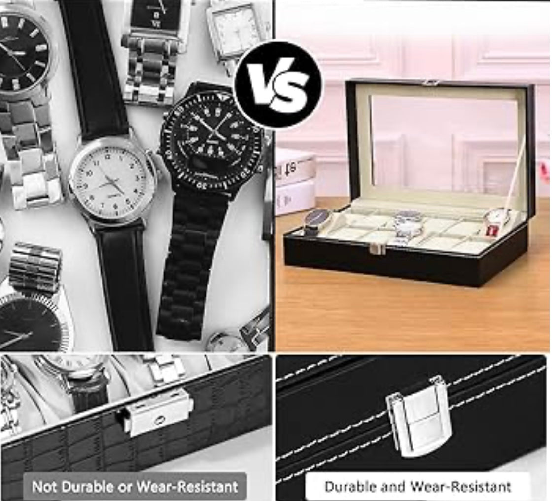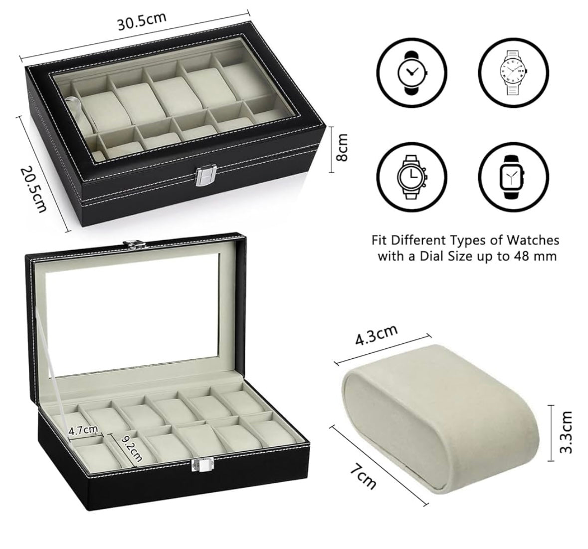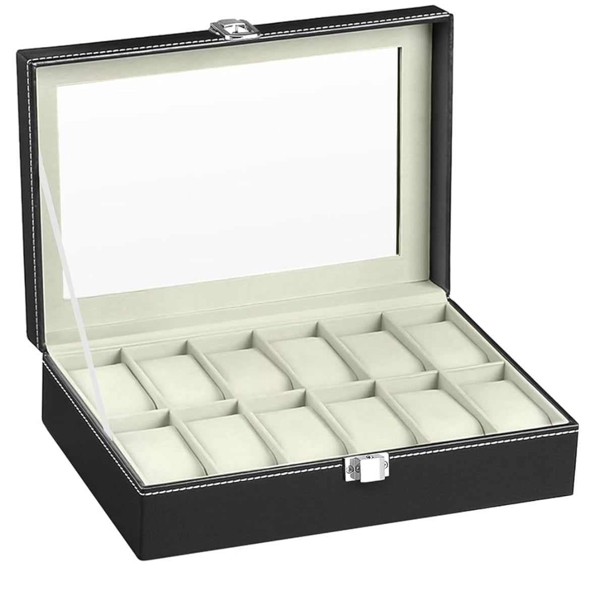Offrez à vos montres une maison de luxe avec cette boîte de rangement à 12 compartiments. Le couvercle en verre vous permet de les admirer sans les toucher, tandis que le design en PU noir/beige les protège de la poussière et de l'humidité. Parfait pour les fêtes, anniversaires ou Noël.