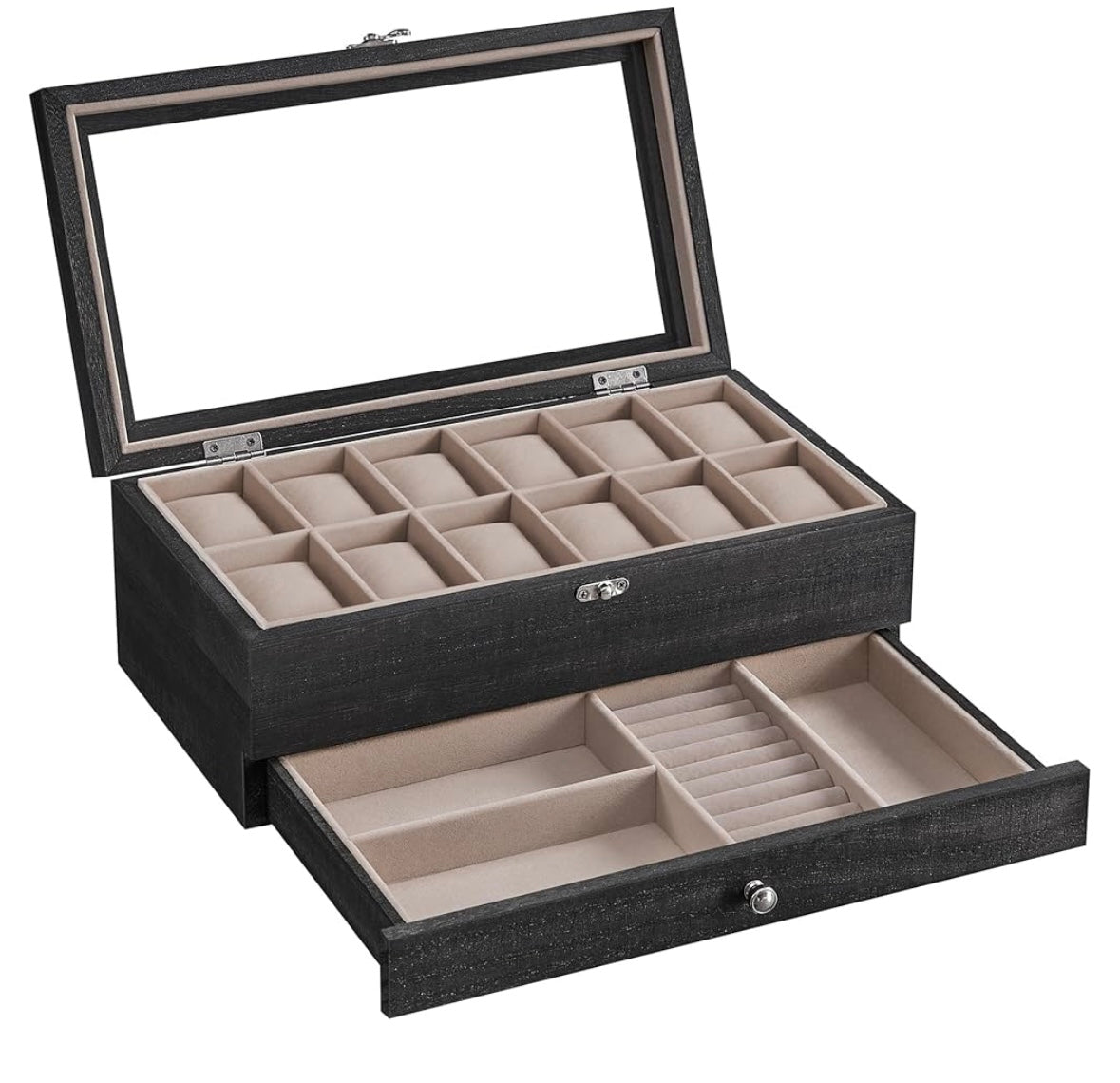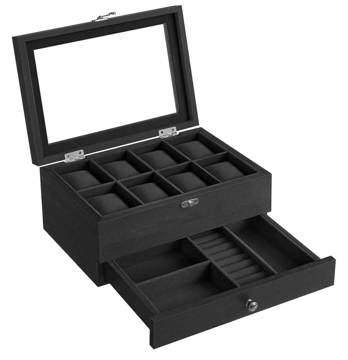 Cette boîte en bois offre une protection élégante pour vos montres et bijoux avec ses 8 emplacements, son couvercle en verre et ses coussinets en velours. Gardez vos objets précieux en sécurité et en bon état avec cette boîte de couleur noisette.