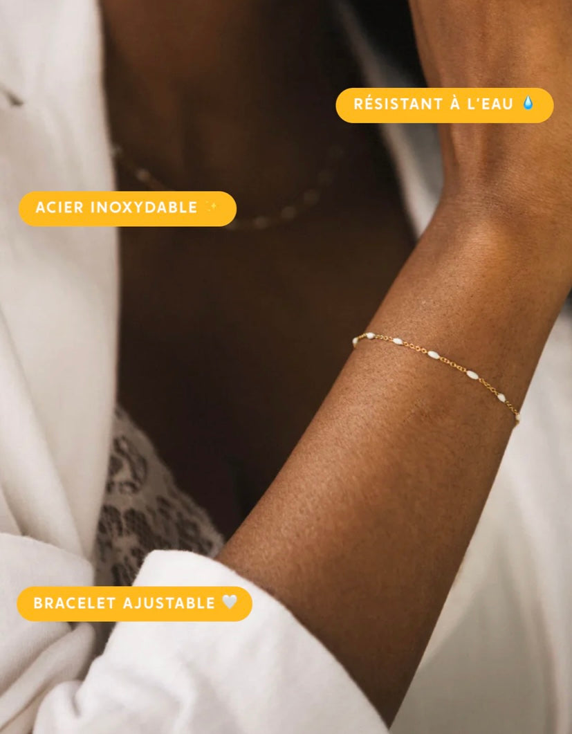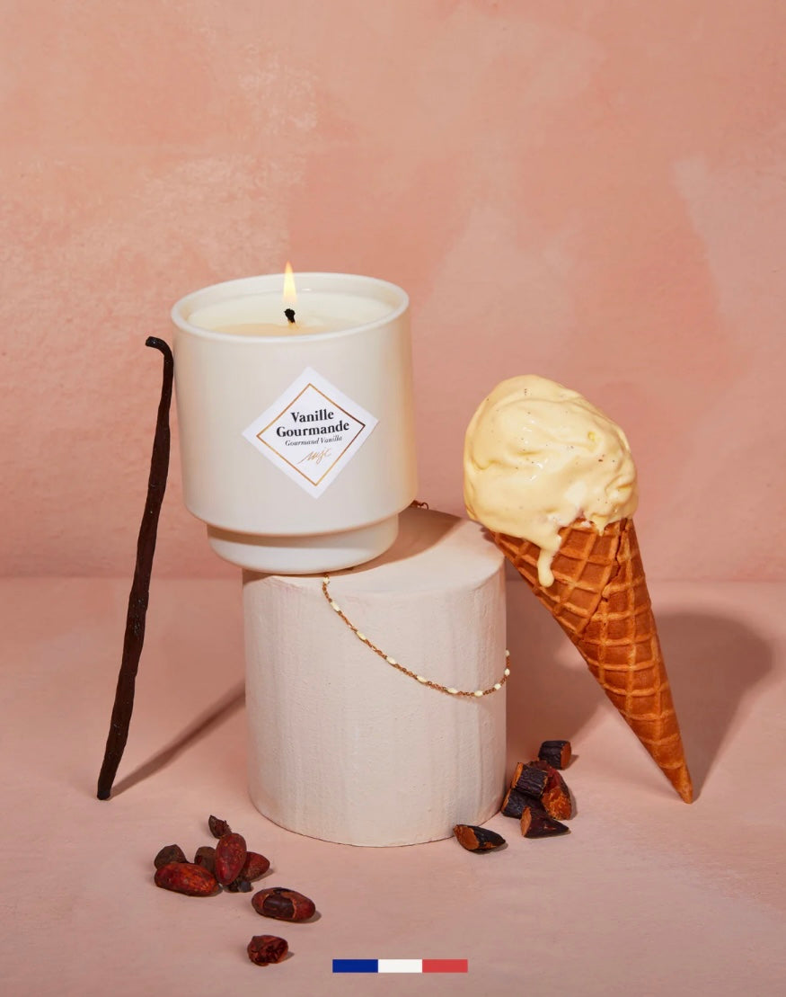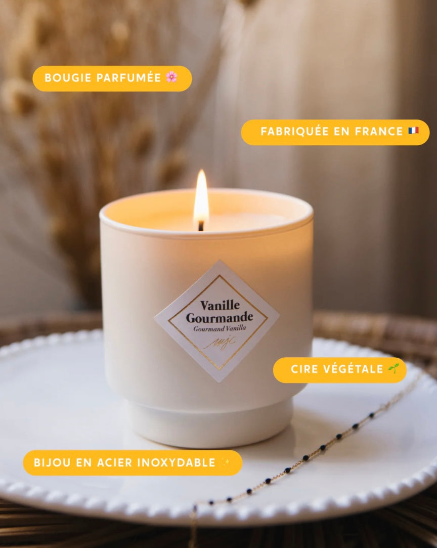 Découvrez notre Bougie surprise ! Fabriquée en France, sa cire 100% végétale et mèche en coton pur libèrent des notes envoûtantes de vanille, cacao et fèves tonka pendant +/- 36 heures. Profitez-en pour admirer le bracelet en acier inoxydable doré à l’or fin 18 carats et orné de perles colorées, offert dans une pochette en aluminium. Bracelet ajustable, résistant à l’eau et hypoallergénique pour un bonheur parfumé sans limites.