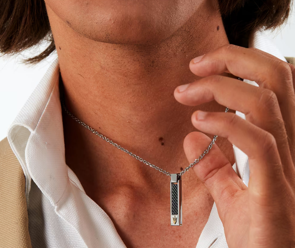 Ce collier en acier inoxydable Maserati est conçu pour les hommes avec style. De dimensions réglables de 45cm à 50cm, il est léger avec un poids de seulement 0,010 gr. Le fermoir à boucle à mousqueton est facile à utiliser et le pendentif rectangulaire lui donne une allure unique. Livré dans un emballage d'origine Maserati.